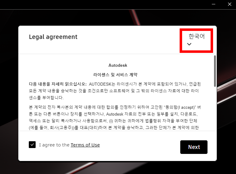 자동 설치가 끝난 뒤, 언어 설정을 반드시 '한국어'라고 바꿔주셔야 합니다. '동의' 체크 후 'Next' 클릭하시면 됩니다.